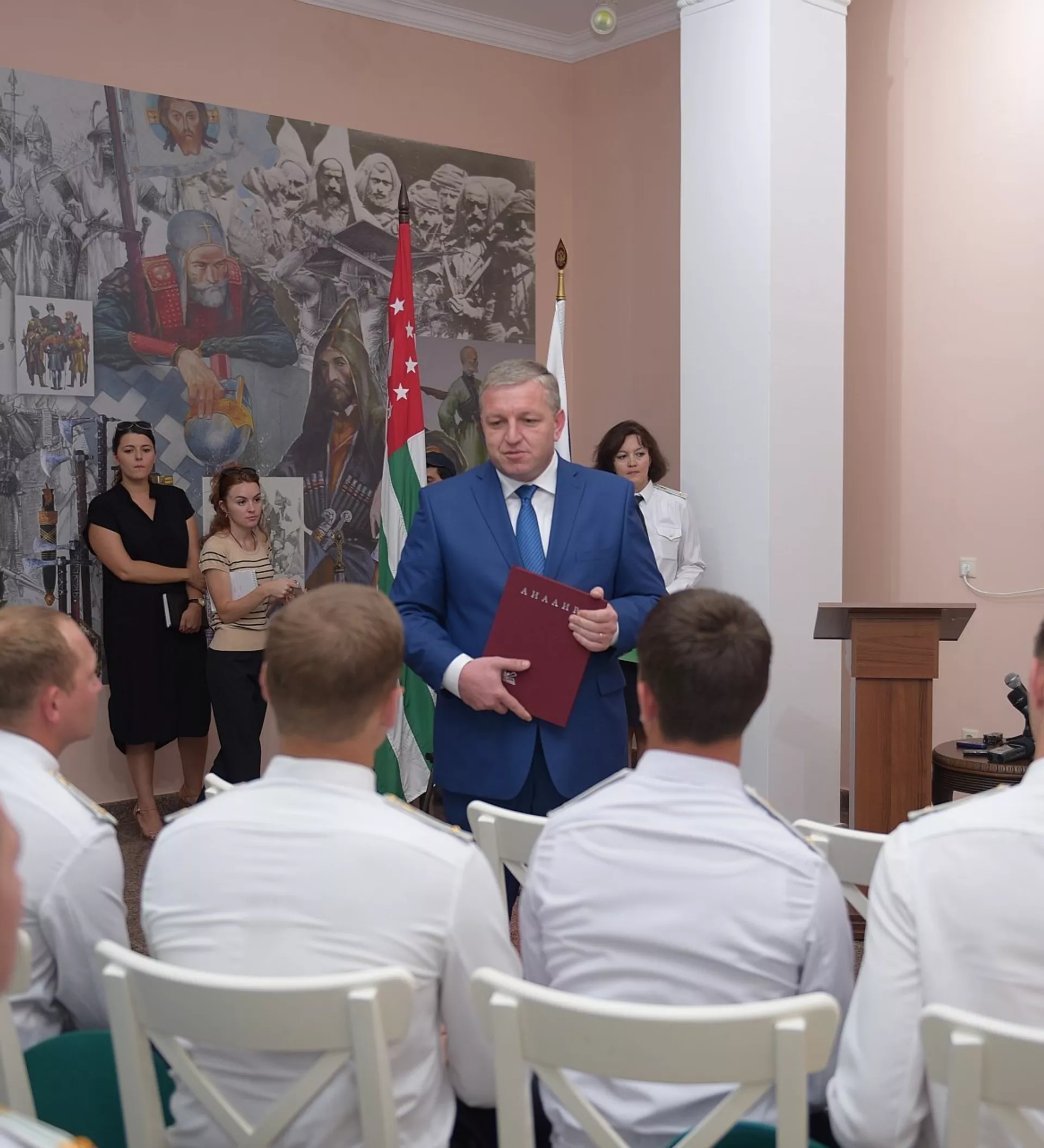"Мы рады приветствовать вас в Абхазии, я искренне поздравляю вас с окончанием учебы. Впереди вас ждет непростая, интересная и очень ответственная работа. Вы находитесь на передовом рубеже защиты безопасности государства. Благодаря вашей работе в стране сохраняется мир и стабильность", — сказал премьер-министр Абхазии Беслан Барциц.