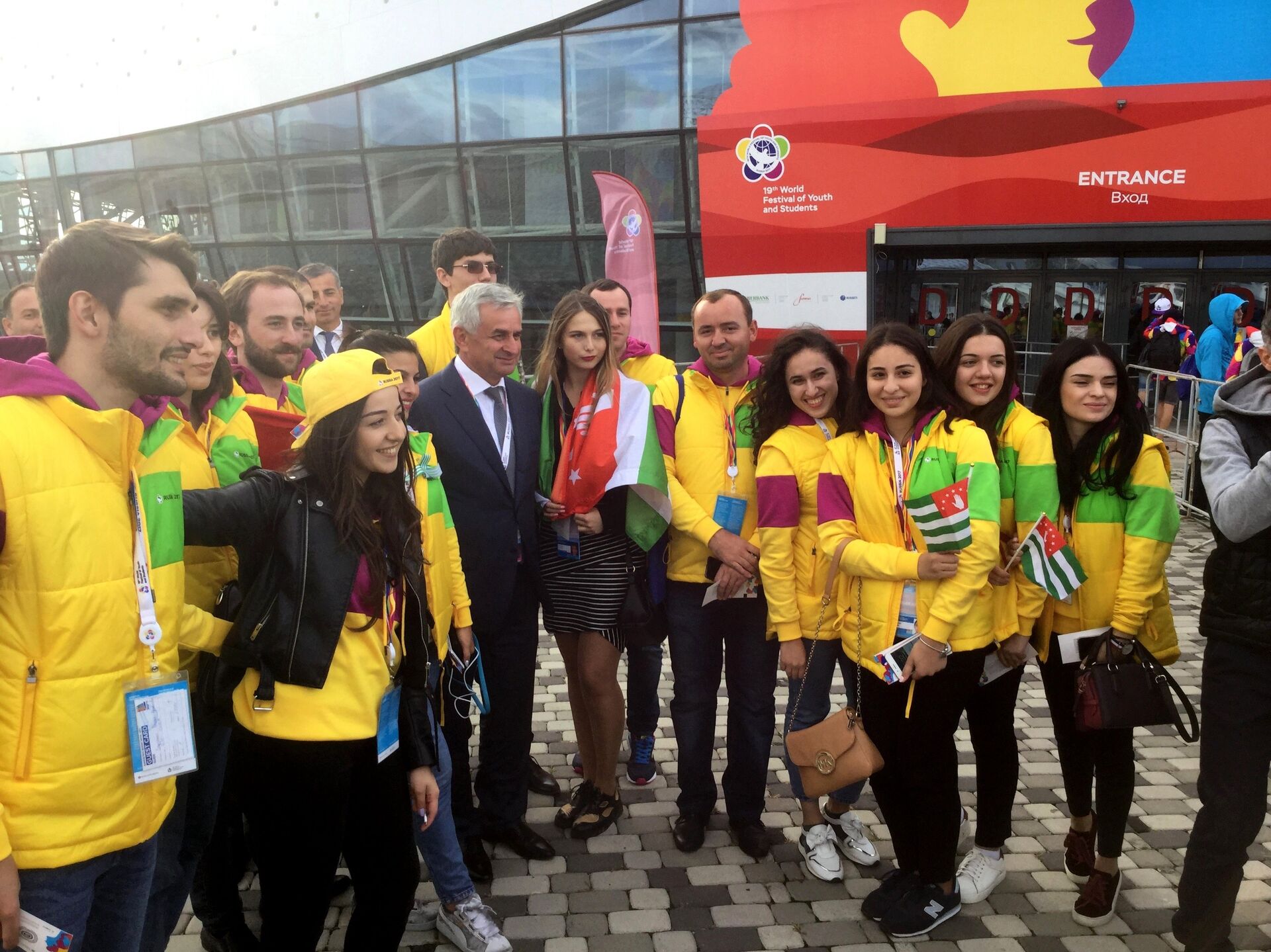 Для абхазских участников приезд Рауля Хаджимба стал неожиданностью. У входа в Ледовый дворец "Большой" абхазские участники сначала фотографировались на память с иностранными гостями, а затем и с президентом своей страны.