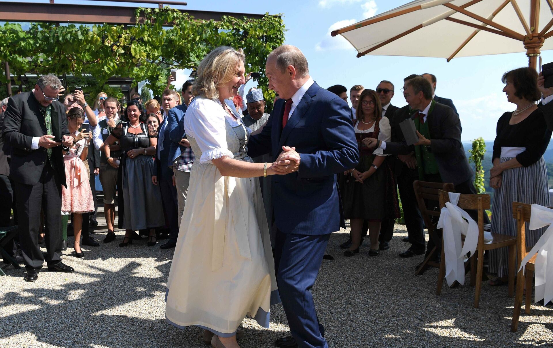СУХУМ, 19 авг — Sputnik. В интернете опубликованы первые кадры со свадьбы главы австрийского МИД Карин Кнайсль, на которой присутствовал Владимир Путин. Президент России посетил церемонию в субботу, 18 августа, сообщает телеканал "Звезда".