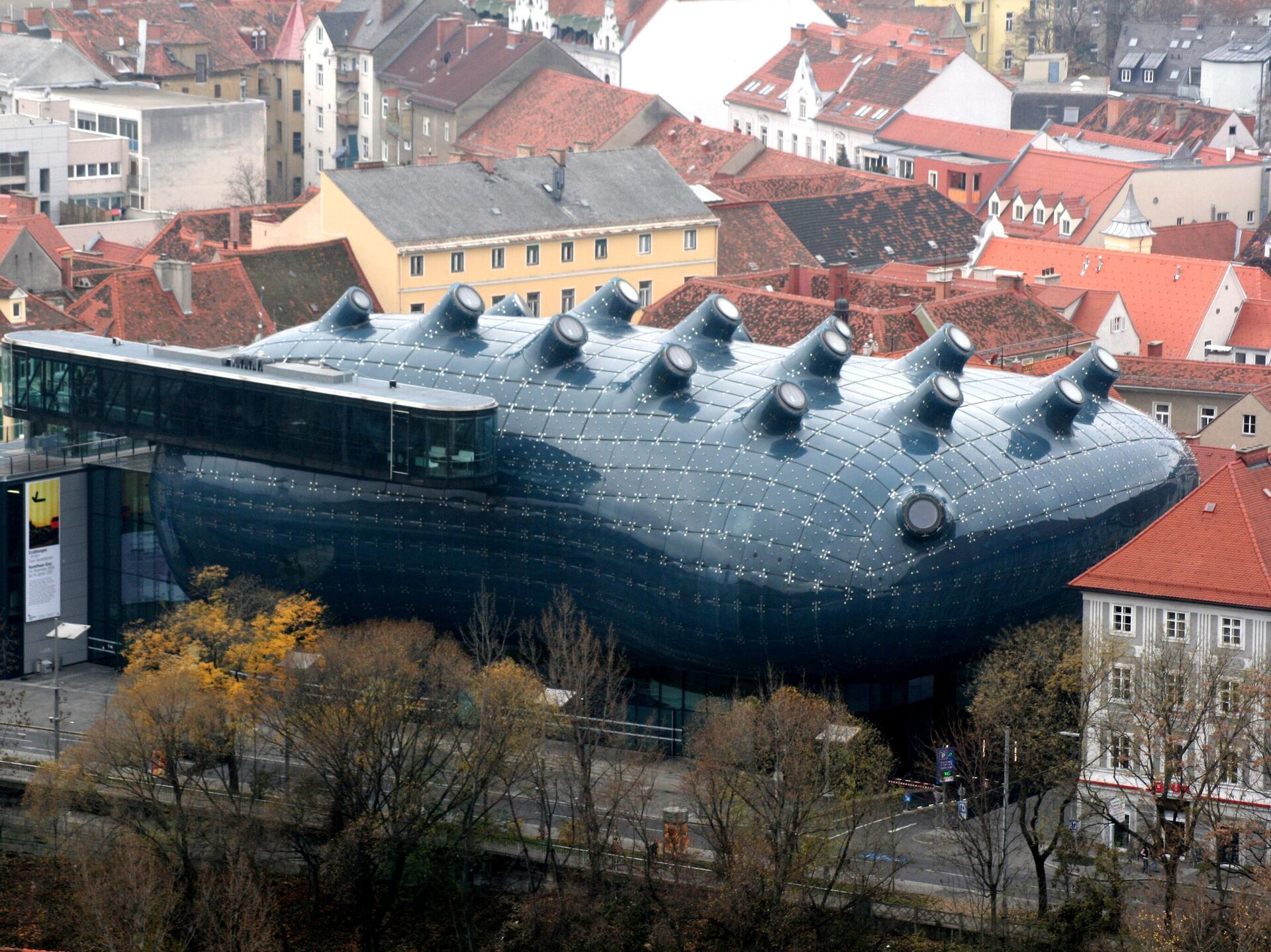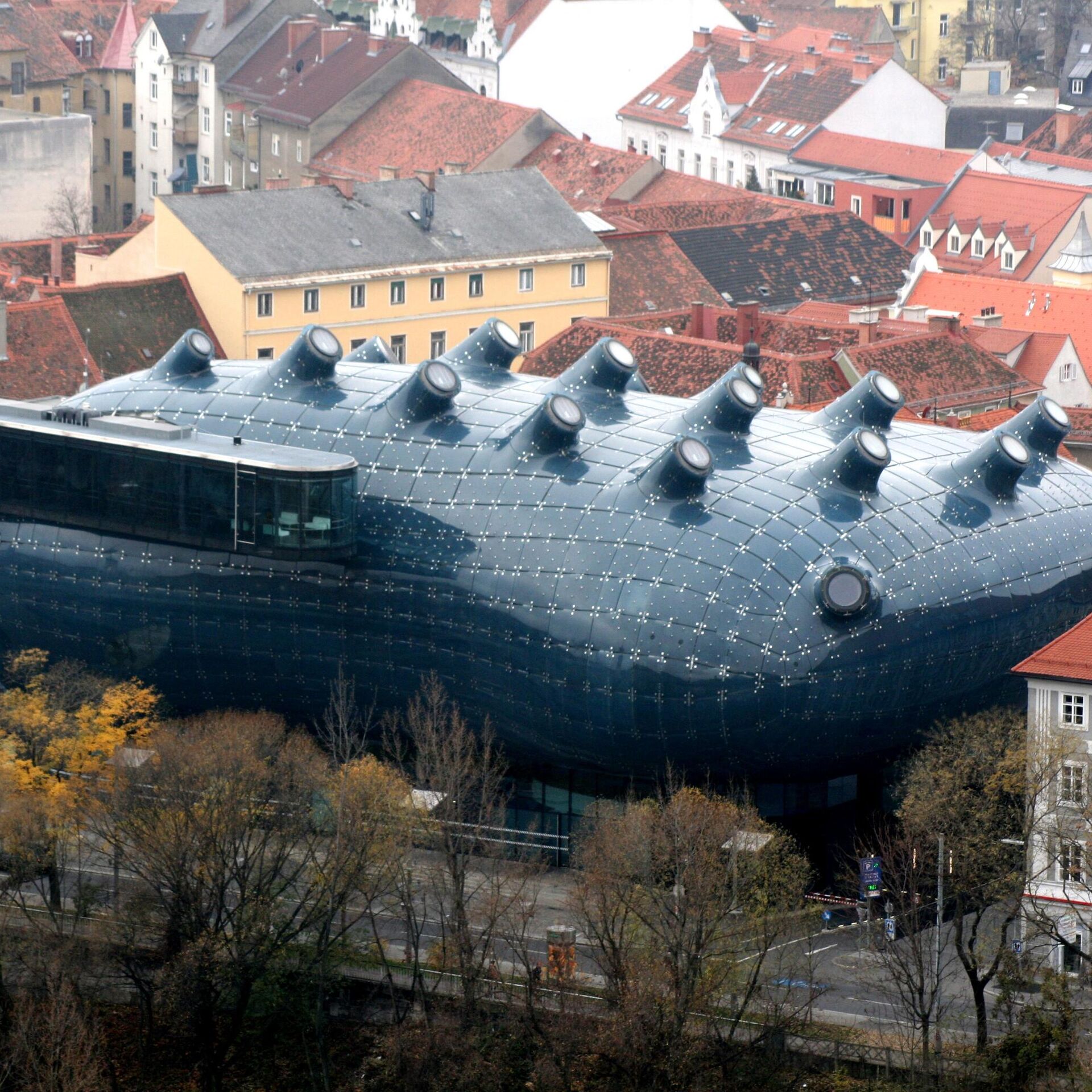 Галерея современного искусства Кунстхаус в Граце, Австрия Открыта в рамках программы "Культурная столица Европы" в 2003 году. Концепт здания разработали лондонские архитекторы Питер Кук и Колин Фурнье. Здание построено в стиле "блоб", резко контрастирующем с окружающей застройкой, и напоминает своим видом сердце робота.