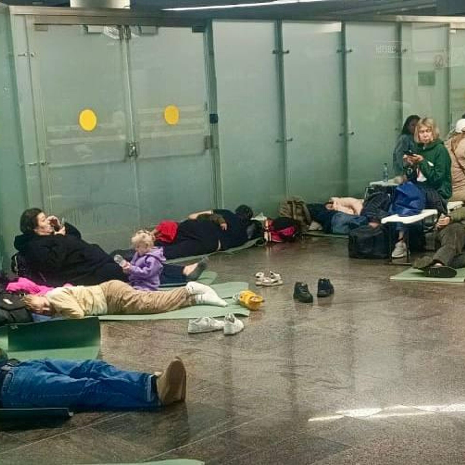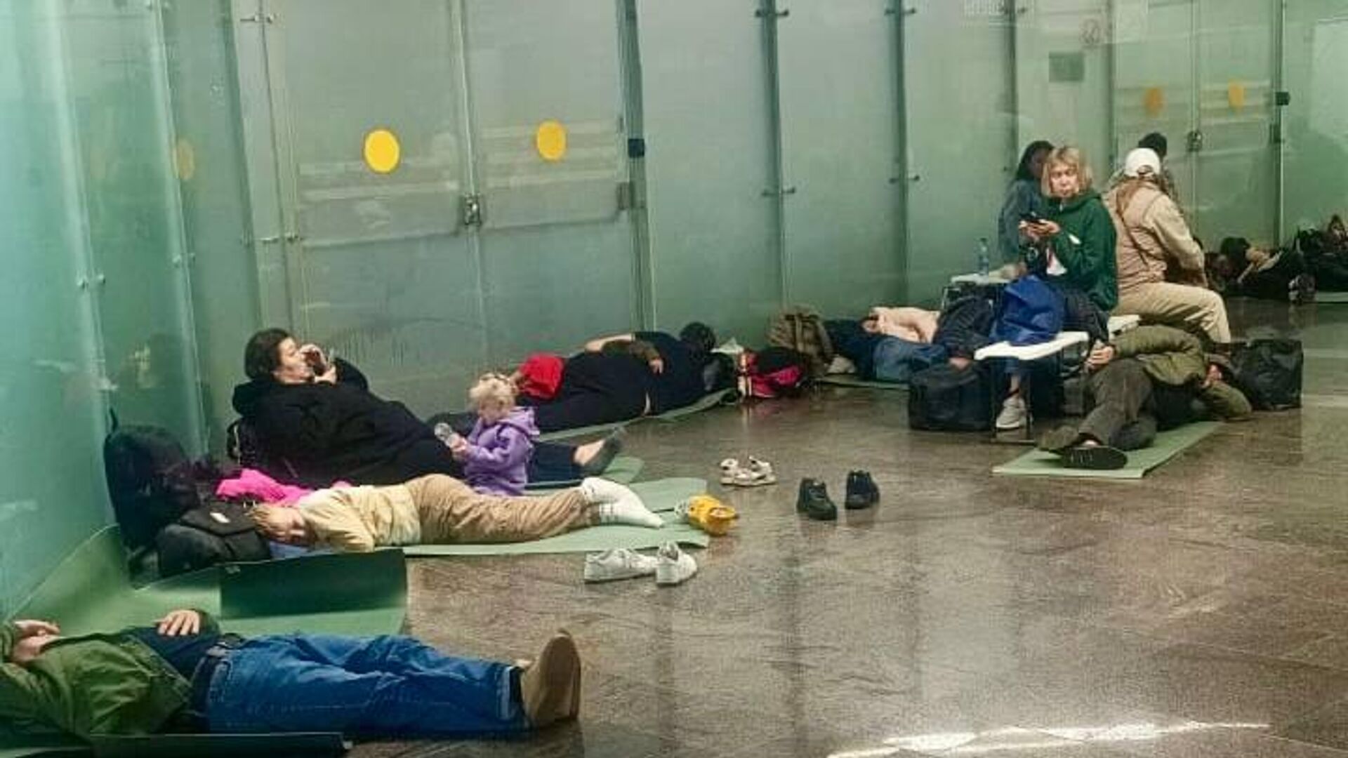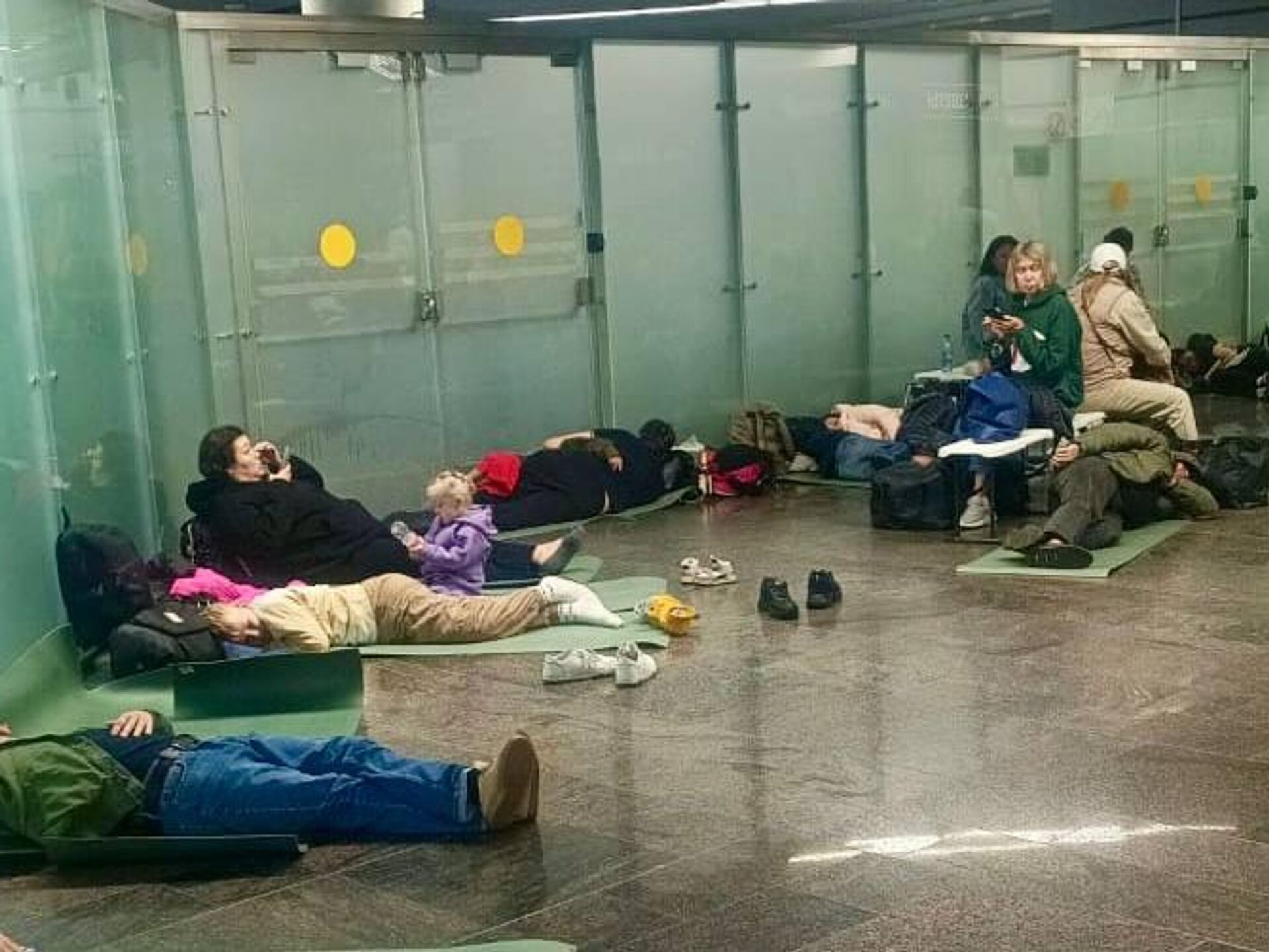 Пассажирам, ожидающим вылета, раздали матрасы, пледы и коврики.