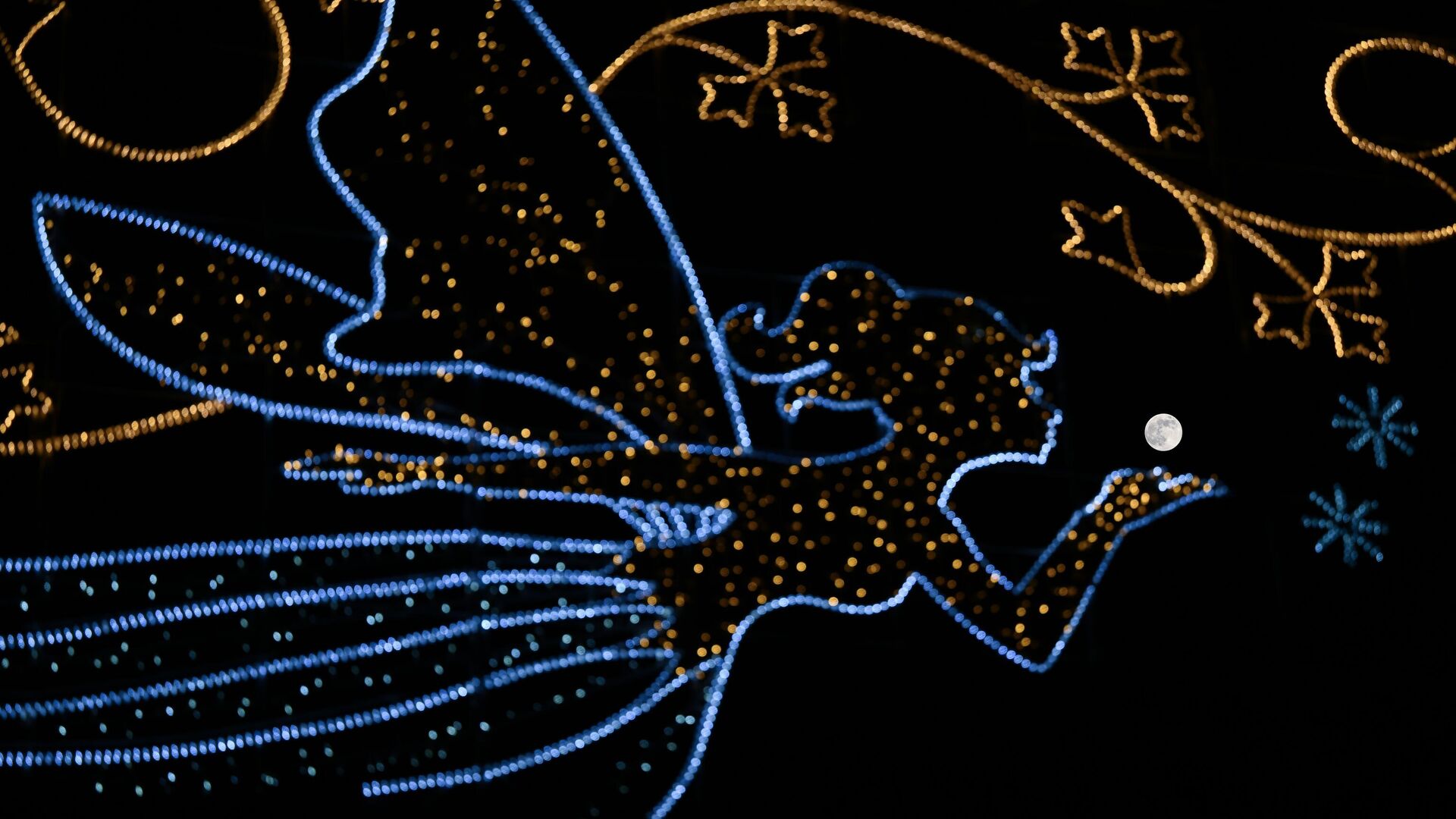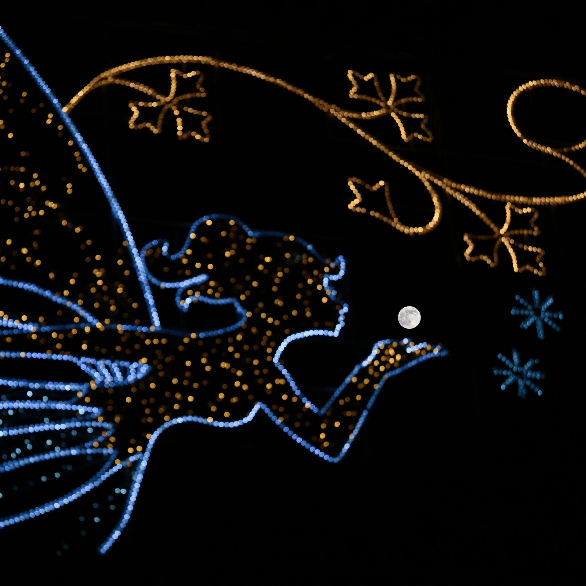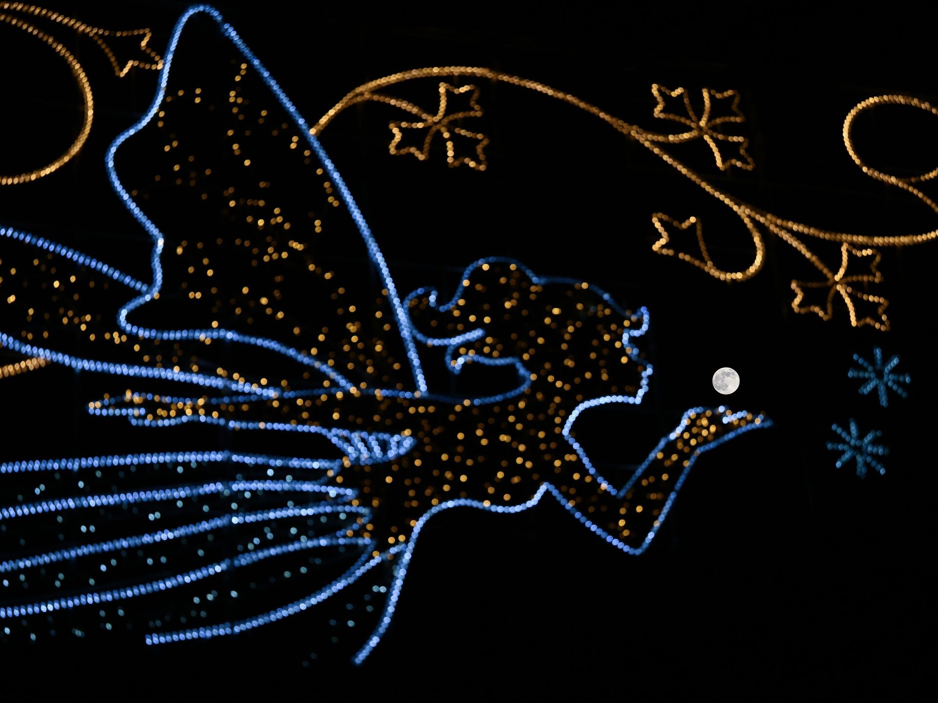 © Getty Images / Anadolu/Rasid Necati Aslim В Лондоне на ночном небе появляется полная луна, идеально расположенная за городским фонарем в форме феи. Кажется, что фея дует в сторону луны, создавая волшебный и сказочный эффект. Урбанистический пейзаж контрастирует с небесным светом, подчёркивая игру между городскими огнями и природным сиянием луны