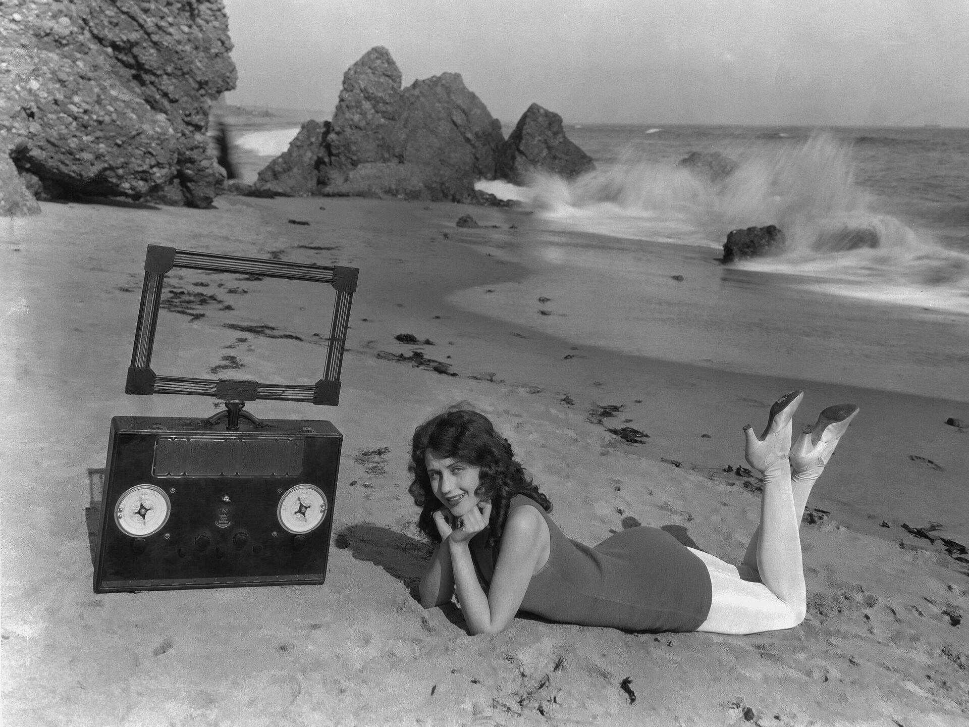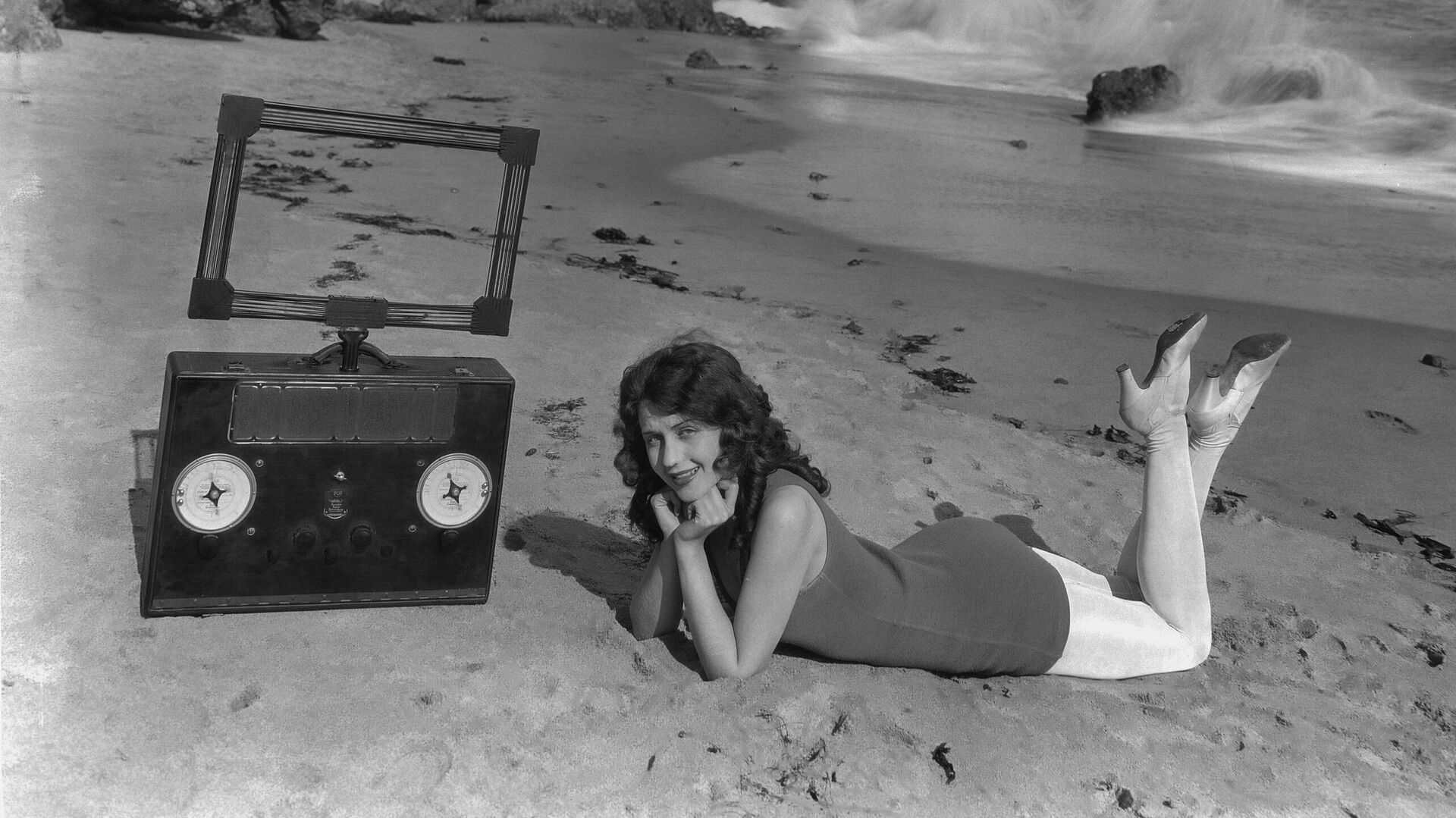 © Getty Images / Camerique Девушка на пляже в Калифорнии со старинным радиоприемником