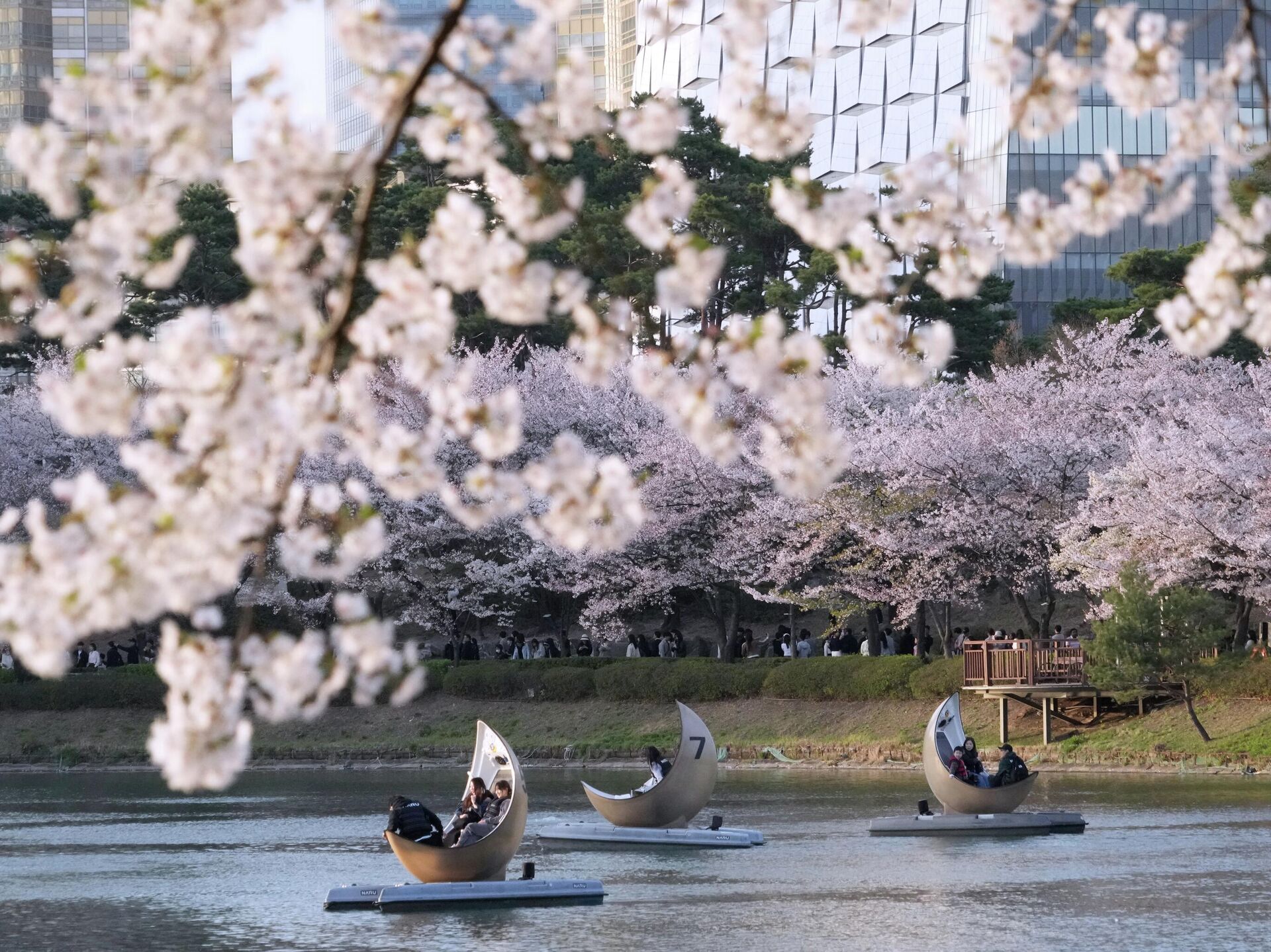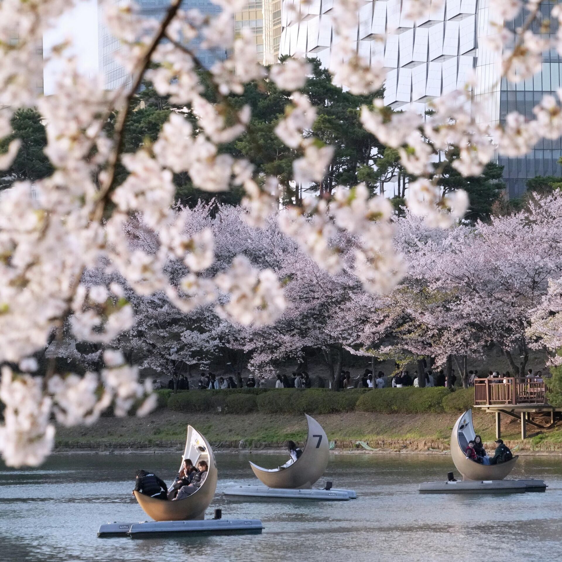 Многие люди хотят любоваться цветущими деревьями с воды.